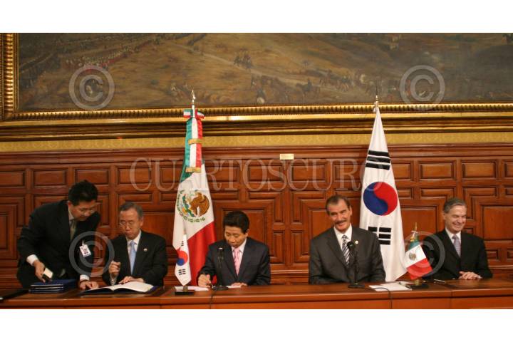 MEXICO, D.F. 09SEPTIEMBRE2005.- Roh Moo Hyun presidente de la República de Corea, el presidente Vicente Fox y el canciller Luis Ernesto Debez durante la firma la de acuerdos comerciales entre ambas naciones. FOTO: Nelly Salas/CUARTOSCURO.COM