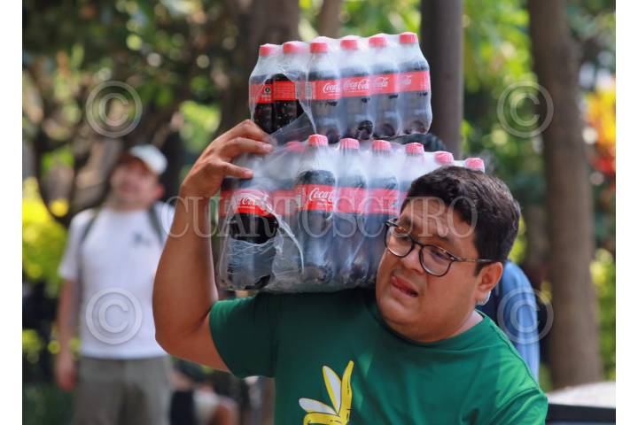 CUERNAVACA, MORELOS, 29ABRIL2025.- Un hombre carga dos paquetes de refresco en la Plaza de Armas de la capital de Morelos. México es uno de los países con mayor consumo de regreso de refresco per cápita, con 163 al año por persona. FOTO: MARGARITO PÉREZ RETANA/CUARTOSCURO.COM