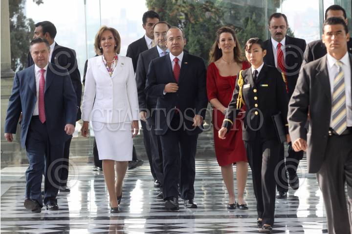 MÉXICO, D.F., 17MARZO2009.- Eduardo Medina Mora titular de la Procuraduría General de la República, María Elena Morera Presidenta saliente de México Unido Contra la Delincuencia, Felipe Calderón presidente de México,Ana Franco nueva presidenta de México Unido contra la delincuencia a su llegada al castillo de chapultepec en donde el mandatario tomo protesta al consejo directivo 2009-2012 de México Unido contra la delincuencia. FOTO: SÁSHENKA GUTIÉRREZ/CUARTOSCURO.COM