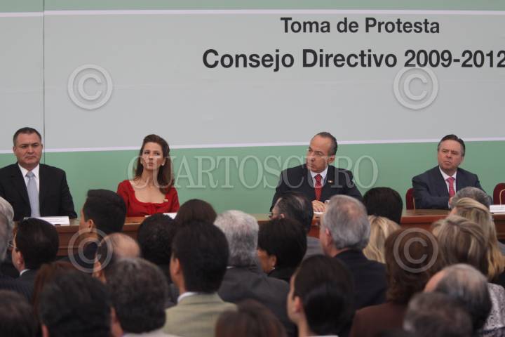 MÉXICO, D.F., 17MARZO2009.-Genaro García Luna, Ana Franco nueva presidenta de México Unido contra la delincuencia, Felipe Calderon presidente de México, Eduardo Medina Mora titular de la Procuraduría General de la República, en el castillo de Chapultepec en donde el mandatario tomo protesta al consejo directivo 2009-2012 de México Unido contra la delincuencia. FOTO: SÁSHENKA GUTIÉRREZ/CUARTOSCURO.COM