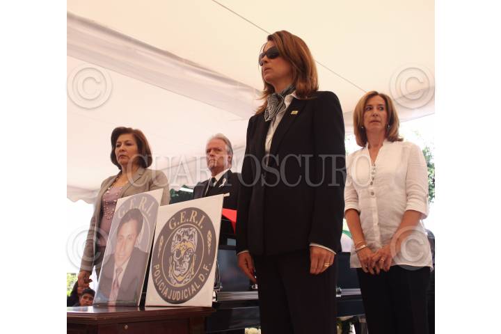 MÉXICO, D.F., 04JULIO2009.- Los ciudadanos Isabel Miranda de Wallace, Alejandro Martí, María Elenea Morera y Ana Franco Wattnem, presidenta de México Unido Contra la Delincuencia, montaron un guardia de honor en el feretro del comandante Carlos Julio Rincón Juárez , uno de los agentes que cayeron abatidos durante un operativo para rescatar a una secuestrada, esto durante el homenaje que les organizó la procuraduría. FOTO: MOISÉS PABLO/ CUARTOSCURO.COM