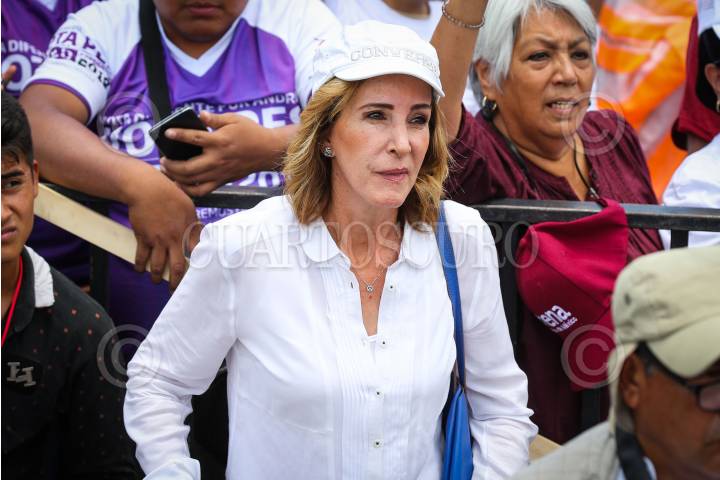 CIUDAD DE MÉXICO, 03JUNIO2018.- María Elena Morera, presidenta de la organización Causa en Común, acompañó al candidato a la presidencia de la república Andrés Manuel López Obrador a uno de sus mitines que sostuvo este medio día en la delegación Gustavo A. Madero. FOTO: MISAEL VALTIERRA / CUARTOSCURO.COM