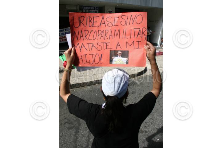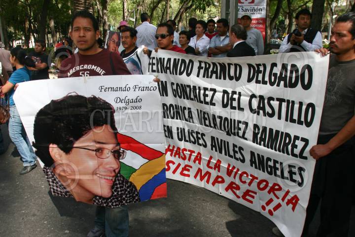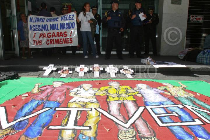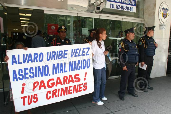 MÉXICO, D.F., 01MARZO2010.- Padres y familiares de las victimas de Sucumbíos se manifestaron frente a la Embajada de Ecuador en México, exigiendo que los procesos judicales y la extradición de Lucia Morett sean retirados, así mismo exigieron la destitución de presidente Alvaro Uribe por la responsabilidad del asesinato de cuatro estudiantes después de los bombardeos perpetrados por el ejercito de Colombia en territorios ecuatorianos hace dos años. FOTO: SAÚL LÓPEZ/CUARTOSCURO.COM