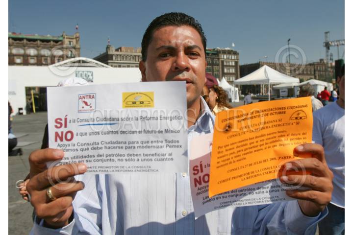 MÉXICO, D.F., 01JUNIO2008.- El asambleista perredista Humberto Morgan Colón, encabezó un volanteó en la plancha del Zócalo, para promover la consulta ciudadana en torno a la Reforma Energética que actualmente se discute en el Senado de la República a lo cual señalo que es indispensable la opinión ciudadana y que una decisión tan importante no sea tomada por unos cuantos. FOTO: MOISÉS PABLO/CUARTOSCURO.COM