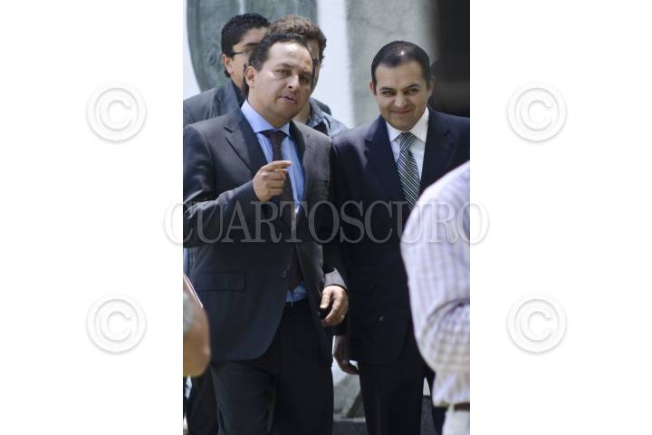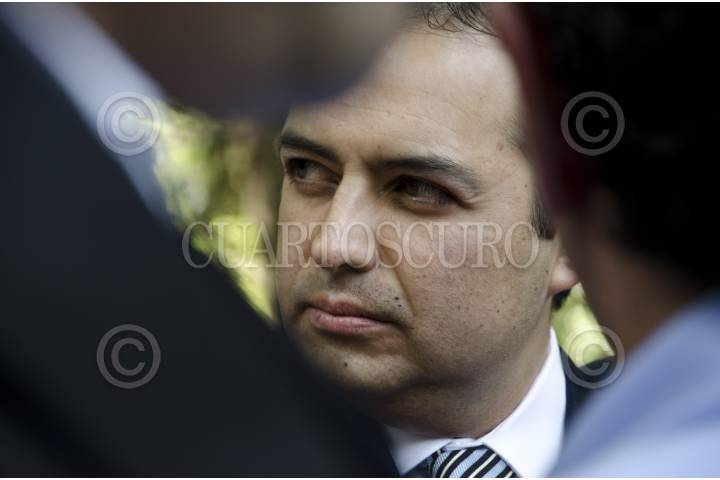 MÉXICO, D.F., 14SEPTIEMBRE2011.- Maximiliano Cortazar, ex director de Comunicación Social de la Presidencia de la República, da indicaciones de donde colocarse a Ernesto Cordero, pre candidato del Partido Acción Nacional (PAN) a la presidencia de la República, durante un homenaje que se le realizó a Manuel Gómez Morin, fundador del PAN con motivo del 75 Aniversario de este instituto político. FOTO: MISAEL VALTIERRA/CUARTOSCURO.COM