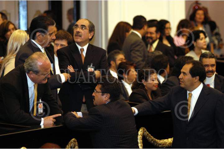 MEXICO, DF 117SEPTIEMBRE2004.- Los senadores Jesus Ortega, Pablo Gómez, Ricardo Morreal y Lázaro Cádenas Batel, gobernador de Michoacán conversan previo al cuarto informe de Andrés Manuel López Obrador, jefe de gobierno del D. F. FOTO: Germán Romero/CUARTOSCURO.COM