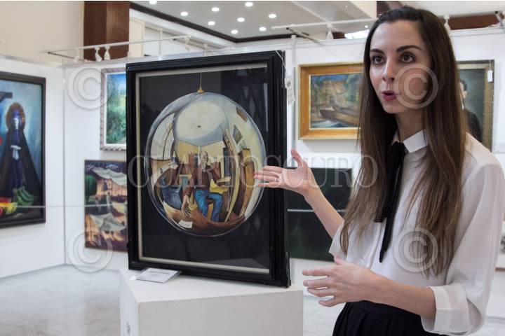 CIUDAD DE MÉXICO, 15MAYO2017.- En las inmediaciones del Club Naval Norte se exhiben las piezas de algunos de los más sobresaliente artistas latinoamericanos, piezas que serán subastadas el próximo día jueves por parte de la Casa de Subastas Morton. Entre las piezas se pueden ver piezas de Juan O'Gorman; Roberto Montenegro; Jorge González Camarena, entre otros. En la imagen, la maestra en Historia del Arte Latinoamericano Pilar Alfonso da el recorrido a los medios de comunicación, a su lado izquierdo se aprecia el autorretrato de Roberto Montenegro. FOTO: GALO CAÑAS /CUARTOSCURO.COM