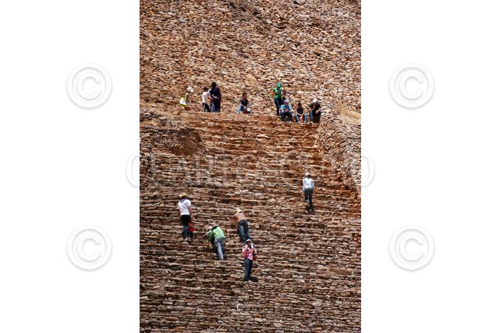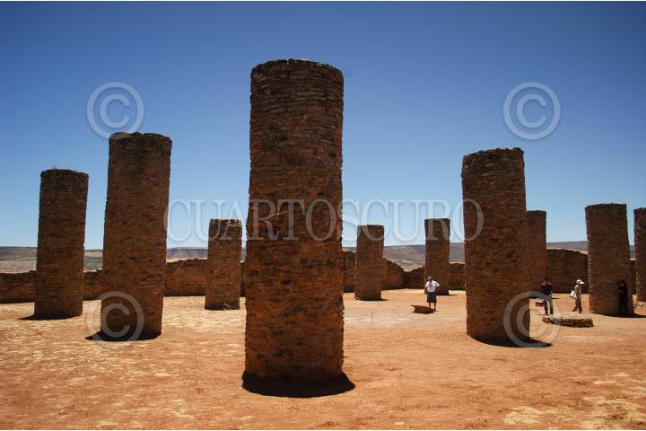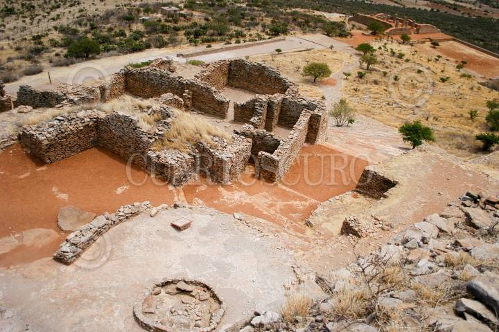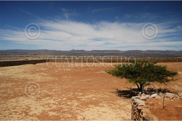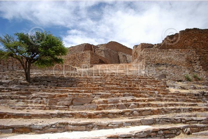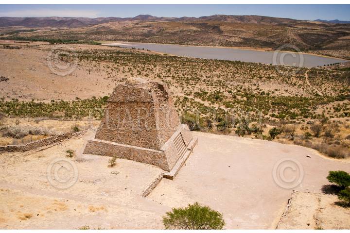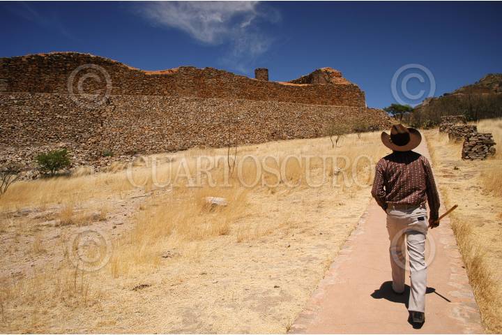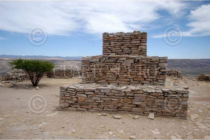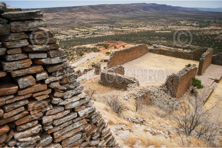 VILLANUEVA, ZACATECAS, 24ABRIL2011.- A 56 kilómetros al sur de la ciudad de Zacatecas sobre la Carretera Federal número 54 Zacatecas-Guadalajara, México, se encuentra la zona arqueólogica La Quemada, nombre dado por haber sufrido un incendio. La Quemada se compone de numerosas plataformas de mampostería de distintas dimensiones que adosadas al cerro, funcionaron como basamentos para las estructuras superiores. Sobre los costados sur y sureste de esa elevación se encuentra una alta concentración de edificaciones de índole ceremonial, varias de las cuales son complejos de plataformas patio-hundido y altar-pirámide. Todos los elementos arquitectónicos de La Quemada están construidos con lajas de reolita, extraídas de la loma que se observa hacia el noreste de la Pirámide Votiva. FOTO: ADOLFO VALTIERRA/CUARTOSCURO