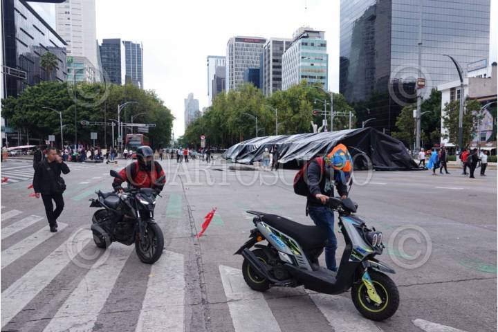 CIUDAD DE MÉXICO, 04JUNIO2025.- Motociclistas transitan caminando junto a su motocicleta por Avenida Insurgentes y Paseo de la Reforma debido a un plantón de más de 24 horas que mantiene un grupo de estudiantes de la Escuela Normal Rural "Plan de Ayala", en donde exigen justicia por la muerte de uno de sus compañeros, quien presuntamente recibió un disparo en la cabeza durante una manifestación frente a la Normal Rural Mactumactzá, el pasado 15 de mayo. FOTO: GRACIELA LÓPEZ/CUARTOSCURO.COM