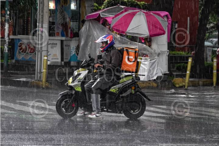 CIUDAD DE MÉXICO 19JUNIO2025.- Un repartidor por aplicación, continua su viaje en motocicleta, mientras un chubasco sorprende en la capital. FOTO:ROGELIO MORALES /CUARTOSCURO.COM