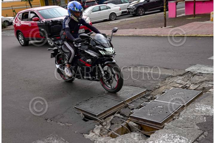 CIUDAD DE MÉXICO 15JULIO2025.- Un motociclista se topa con el hundimiento de varios registros de agua mientras circula en Avenida San Jerónimo de la Alcaldía Magdalena Contreras. FOTO: ROGELIO MORALES /CUARTOSCURO.COM