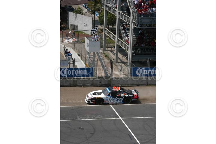 MÉXICO D.F. 03JUNIO2007.-El auto de German Quiroga de la escuderia Motorola Telcel cruza la linea de meta logrado el triunfo de la serie NASCAR que se realizo en el Autodromo de los Hermanos Rodríguez. FOTO: GUILLERMO PEREA/CUARTOSCURO.COM