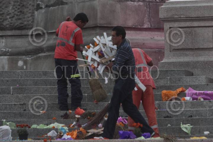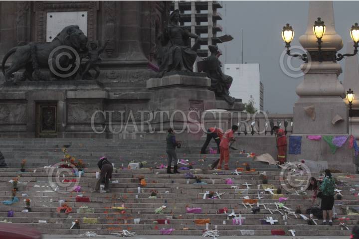 MÉXICO, D.F., 03NOVIEMBRE2011.- Trabajadores de limpieza de la ciudad recogieron la basura que quedo en el Ángel de la Independencia como cruces y veladoras luego que en días pasados el movimiento por la paz con justicia y dignidad realizara una manifestación. FOTO: ENRIQUE ORDÓÑEZ/CUARTOSCURO.COM