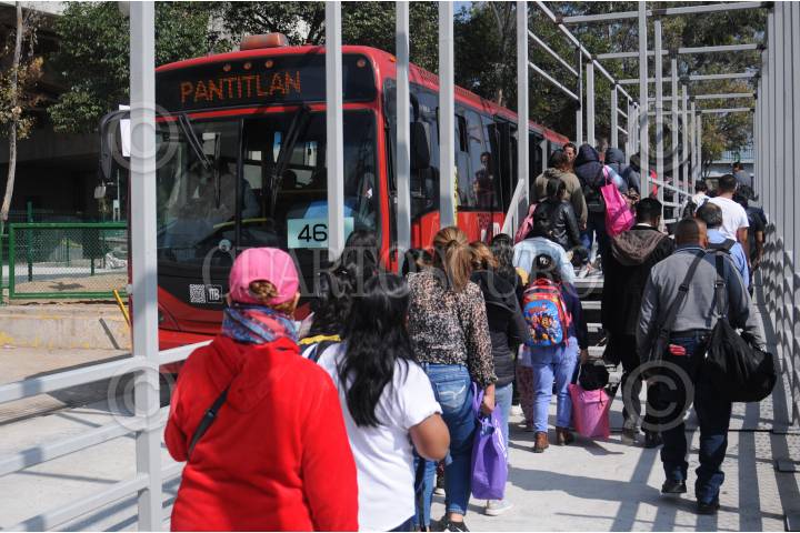 CIUDAD DE MÉXICO, 17DICIEMBRE2023. - Decenas de personas abordan el Metrobús que apoyará a la línea 9 del metro mientras realizan mantenimiento a tres de sus estaciones. FOTO: DANIEL AUGUSTO /CUARTOSCURO.COM