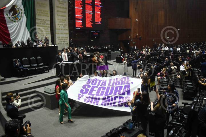 CIUDAD DE MÉXICO, 25MARZO2025.- Diputadas de Movimiento Ciudadano, muestran una manta con la frase "vota libre, segura y sin miedo", durante la sesión ordinaria de la Cámara de Diputados en la que se somete a discusión el dictamen de la Sección Instructora para el desafuero de Cuauhtémoc Blanco, diputado de Morena, por el presunto delito de violencia sexual. FOTO: MARIO JASSO/CUARTOSCURO.COM