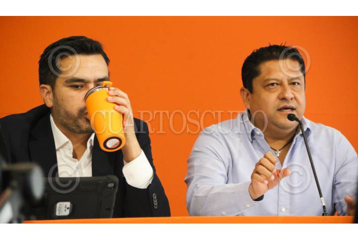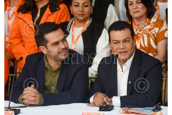 TOLUCA, ESTADO DE MÉDICO, 04JULIO2025.- Jorge Álvarez Máynez, dirigente nacional del Partido Movimiento Ciudadano y el diputado Juan Zepededa durante los trabajos de la 7a Asamblea de la Coordinación Nacional de Diputadas y Diputados de Movimiento Ciudadano a las Legislaturas de los Estados; en donde aseguró que el partido sumará todos sus esfuerzos con miras al 2027 para que el Estado de México se pinte de naranja, como Veracruz y Durango. FOTO: CRISANTA ESPINOSA AGUILAR /CUARTOSCURO.COM
