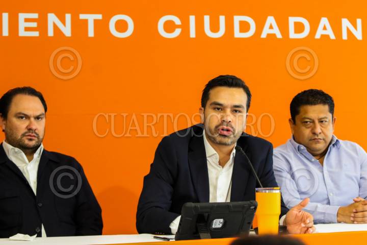CIUDAD DE MÉXICO. 10JUNIO2025.- Jorge Alvarez Maynez y Mariano Romero, candidato a alcalde en Papantla y Agustín Torres en la conferencia de prensa de Movimiento Ciudadano. FOTO: VICTORIA VALTIERRA/CUARTOSCURO.COM