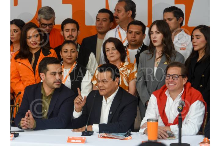 TOLUCA, ESTADO DE MÉDICO, 04JULIO2025.- Jorge Álvarez Máynez, dirigente nacional del Partido Movimiento Ciudadano, los diputados Juan Zepeda, Salomón Chertorivski, Jessica Ortega de la Cruz, durante los trabajos de la 7a Asamblea de la Coordinación Nacional de Diputadas y Diputados de Movimiento Ciudadano a las Legislaturas de los Estados; en donde aseguró que el partido sumará todos sus esfuerzos con miras al 2027 para que el Estado de México se pinte de naranja, como Veracruz y Durango, y se reiteró el respaldo al diputado local Juan Zepeda para lograr esto. FOTO: CRISANTA ESPINOSA AGUILAR /CUARTOSCURO.COM