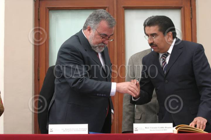 MEXICO, D.F. 23NOVIEMBRE2005.- Alejandro Encinas, jefe de gobierno de la ciudad de México saluda a Eliseo Moyao Morales, delegado de Tlalpan al termino de la Firma de Convenio de Colaboración y Coordinación entre la Delegación Tlalpan y el Instituto Nacional de Antropología e Historia. FOTO: Nelly Salas/CUARTOSCURO.COM