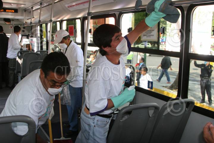 MÉXICO, D.F., 05MAYO2009.- El gobierno del Distrito Federal comenzo la limpieza profunda del Metrobus, esta limpieza se realizara cada 2 horas, se hará desinfección de pasamanos en las 221 unidades del Metrobús. FOTO: RICARDO CASTELAN/CUARTOSCURO.COM
