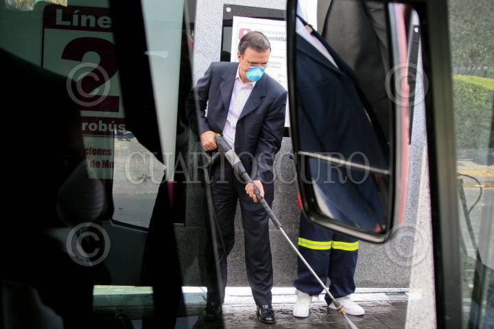 MÉXICO, D.F., 05MAYO2009.- Marcelo Ebrard Casaubon jefe de gobierno del Distrito Federal, inicio la limpieza profunda del Metrobús, esta limpieza se realizara cada 2 horas, se hará desinfección de pasamanos en las 221 unidades del Metrobús. FOTO: RICARDO CASTELAN/CUARTOSCURO.COM