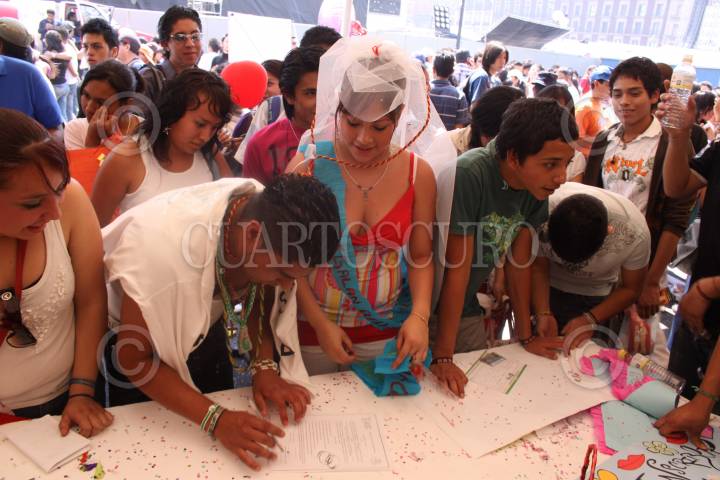 MÉXICO, D.F., 14FEBRERO2009.- En la plancha del zócalo capitalino se desarrollo la feria Amor es sin violencia "bésame mucho" para romper el récord Guiness de mayor numero de besos, la feria contó con diversas actividades como pintura, y registro civil, donde las parejas acudían a casarse de manera ficticia y a cambio recibian preservativos. FOTO:SÁSHENKA GUTIÉRREZ/CUARTOSCURO.COM