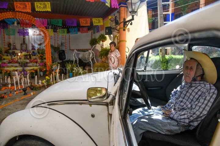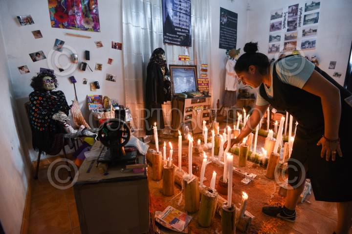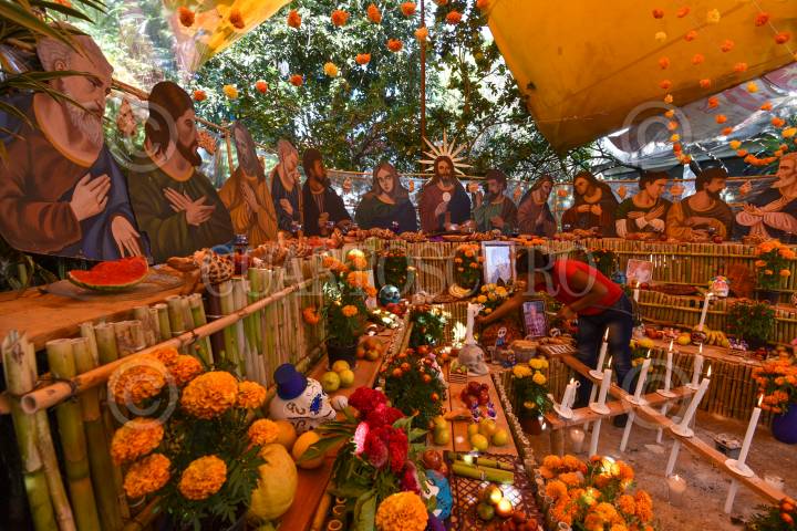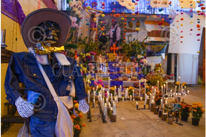 MALINALCO, ESTADO DE MÉXICO, 01NOVIEMBRE2024.- Con ofrendas coloridas y monumentales es como se celebra a los Nuevos Difuntos en Malinalco, los hogares abren sus puertas desde el 28 de octubre hasta el 2 de noviembre a visitantes, en los altares se recrea la vida del fallecido, todos sus gustos y aficiones, en la elaboración las familias llegan a tardarse cerca de 2 meses. Aquellos que visitan las ofrendas llevan una cera o veladora al fallecido lo que representa una luz en su camino y a cambio la familia ofrece dulces, tamales, fruta, pan, ponche, agua o mezcal.FOTO: CRISANTA ESPINOSA AGUILAR /CUARTOSCURO.COM