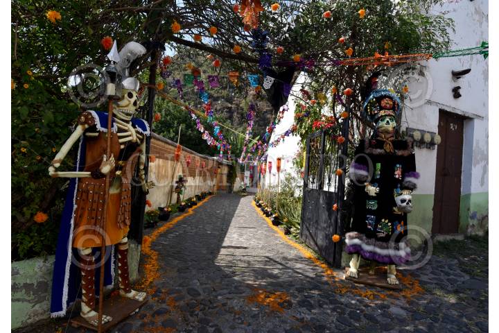 Pobladores de Malinalco tardan hasta dos meses en instalar las ofrendas de los Muertos Nuevos, en donde representan todo lo que le gustaba en vida al nuevo difunto, los visitantes a estas ofrendas monumentales ofrecen una vela o cera que significa luz en el camino del Muerto y a cambio la familia ofrece comida o bebida.