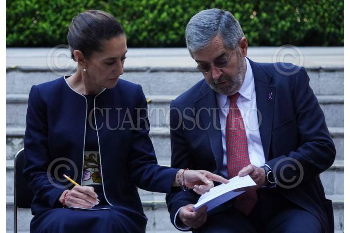 CIUDAD DE MÉXICO, 07MARZO2025.- La presidenta Claudia Sheinbaum conversa con el canciller Juan Ramón de la Fuente durante la ceremonia de nombramiento de un tulipán por parte del gobierno de los Países Bajos que recibió el nombre de “La Mujer Indígena” a petición de quién declaró el 2025 como el Año de la Mujer Indígena. FOTO: GALO CAÑAS/CUARTOSCURO.COM