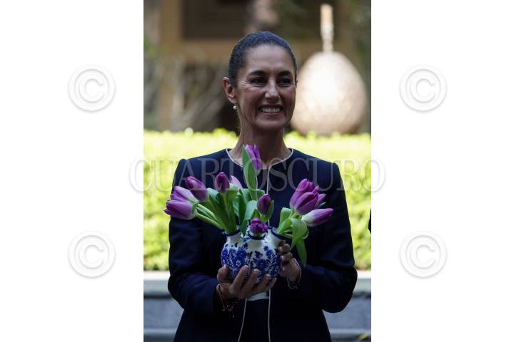 CIUDAD DE MÉXICO, 07MARZO2025.- La presidenta Claudia Sheinbaum Pardo recibió de manos del embajador de Holanda en México, Wilfred Mohr, un ramo de tulipanes tras la ceremonia de nombramiento de un tulipán por parte del gobierno de los Países Bajos que recibió el nombre de “La Mujer Indígena” a petición de la mandataria quién declaró el 2025 como el Año de la Mujer Indígena. FOTO: GALO CAÑAS/CUARTOSCURO.COM
