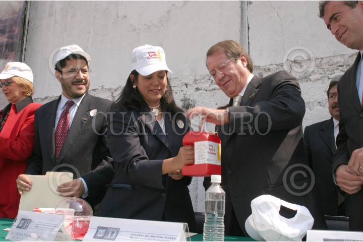 México, D.F., 11MAYO2004.- Virginia Jaramillo, delegada en Cuauhtemoc, le pide su cooperación a Adrián Vargas Guajardo, presidente de Multivisión, durante la ceremonia del inició de la campaña para recaudar fondos y poder construir la nueva estación de bomberos. FOTO: Moisés Pablo/CUARTOSCURO.COM