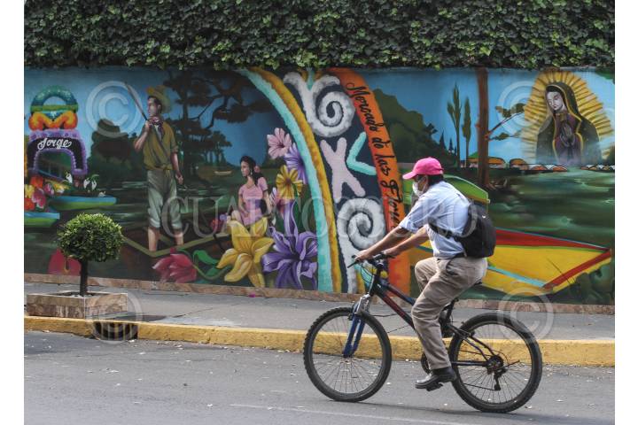 Hombre pedalea su bicicleta frente a mural alusivo a los canales de Xochimilco. FOTO: ROGELIO MORALES /CUARTOSCURO.COM
