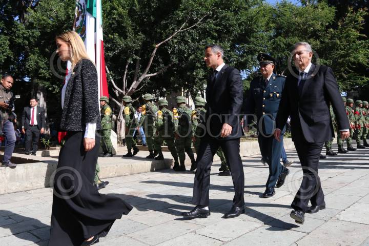 OAXACA, OAXACA, 07SEPTIEMBRE2018.- A un año del sismo del 7 de septiembre y que devastó 41 municipios oaxaqueños, principalmente en la región del Istmo de Tehuantepec, se realizó un acto solemne en la capital del estado que fue encabezado por el gobernador, Alejandro Murat, la titular de la Sedatu, Rosario Robles y Luis Felipe Puente coordinador Nacional de Protección Civil, durante dicho acto un soldado de la Octava Región Militar se desmayó. Posteriormente se realizó una sesión del Consejo Estatal de Protección Civil y finalmente una conferencia de prensa donde hablaron de los avances en la reconstrucción, de acuerdo con sus datos el 80 por ciento de viviendas dañadas ya presentan algún avance. FOTO: ARTURO PÉREZ ALFONSO/ CUARTOSCURO.COM