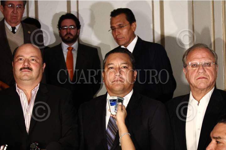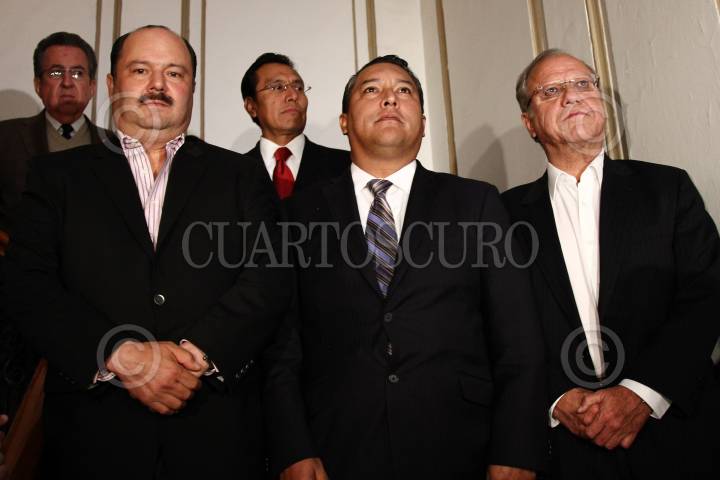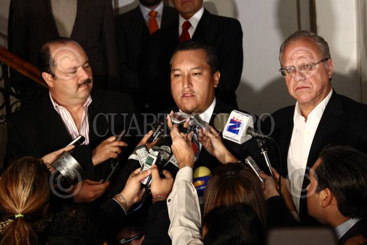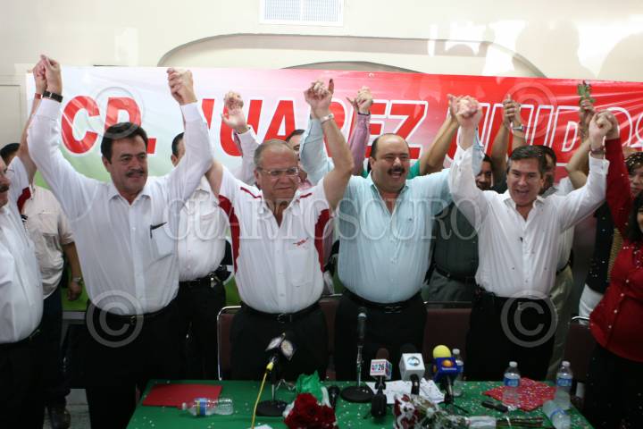 CIUDAD JUAREZ, CHIHUAHUA, 05JULIO2010.- Cesar Horacio Duarte Jaquez, candidato a la gubernatura del estado por la alianza PRI-Panal-PVEM-PT y Hector Murguia, candidato a la presidencia municipal de Ciudad Juarez, asistieron a la sede del partido del PRI en esta ciudad, para pronunciarse ganadores absolutos de la jornada electoral del dia de ayer en dicho estado. FOTO: IGNACIO RUIZ/CUARTOSCURO.COM