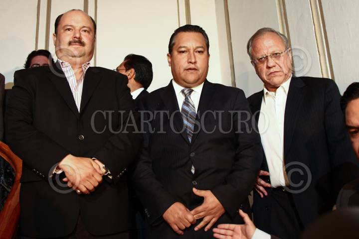 MEXICO, D.F., 28ENERO2011.- Cesar Duarte, Gobernador del Estado de Chihuahua; Francisco Blake Mora, Secretario de Gobernación y Héctor Murguía Lardizábal, presidente municipal de Ciudad Juárez; ofrecieron un mensaje a los medios de comunicación, donde informaron sobre los acuerdos que se realizaron después de la reunión privada que sostuvieron estos funcionarios en la sede central de la Secretaría de Gobernación. FOTO: MISAEL VALTIERRA/CUARTOSCURO.COM