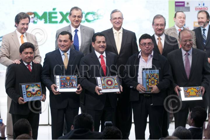 MÉXICO, D.F., 25NOVIEMBRE2011.- Los alcaldes (abajo), de Solidaridad, Quintana Roo, Filiberto Martínez, el de Campeche, Campeche, Carlos Ernesto Rosado, el de Centro, Tabasco,Jesús Alí de la Torre, Tres Valles, Veracruz, Carlos Alberto Córdova, y el de CIudad Juárez, Chihuahua, Héctor Murguía Lardizábal, recibieron un reconocimiento del proyecto "Limpiemos Nuestro México" que lanzó , Grupo Salinas, Fundación Azteca y la Secretaria del Medio Ambiente y Recursos Naturales, la mañana de hoy y que destaca el apoyo recibido por los Alcaldes durante la formación de brigadas de limpieza en los municipios mencionados. Entregasron los premios, Esteban Moctezuma de Fundacion Azteca, El Secretario de del Medio Ambiente y Recursos Naturales, Juan Rafael Elvira Quesada, Ricardo Salinas Pliego de Fundación Salinas y Javier González de grupo Bimbo. FOTO: FRANCISCO RODRÍGUEZ/CUARTOSCURO.COM