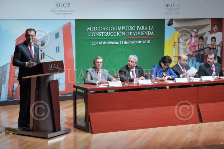 MÉXICO, D.F., 25MARZO2015.- Luis Videgaray, secretario de Hacienda y Crédito Público; Gustavo Luján, presidente nacional de la Cámara Nacional de la Industria de la Construcción; el diputado Carlos Humberto Aceves, de la comisión de vivienda en la Cámara de Diputados; la senadora Maria Elena Barrera, de la comisión de vivienda; Jesus Murillo Karam, titular de la Secretaría de Desarrollo Agrario, Territorial y Urbano y Juan Fernando Abusaid, presidente de Canadevi, encabezaron el evento de presentación de las medidas de impulso para la construcción de vivienda promovida por dichas dependencias federales. FOTO: DIEGO SIMÓN SÁNCHEZ /CUARTOSCURO.COM