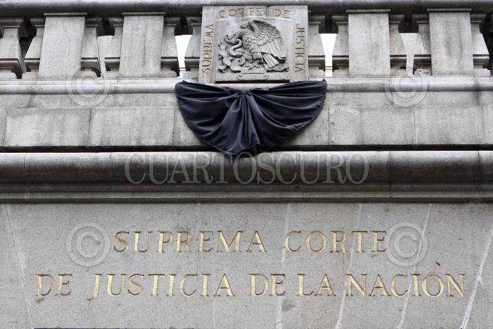 MÉXICO, D.F., 23SEPTIEMBRE2010.- Un moño negro en señal de luto fue colocado a la entrada de la Suprema Corte de Justicia de la Nación (SCJN) en donde hoy se le rindió un homenaje póstumo de cuerpo presente al ministro José de Jesús Gudiño Pelayo quien murio de un infarto el domingo pasado mientras se encontraba en Londres. FOTO: RODOLFO ANGULO/CUARTOSCURO.COM