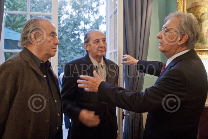 MÉXICO, D.F., 05OCTUBRE2011.- El cantante Oscar Chávez, el poeta Eduardo Lizalde y sue hermano el actor Enrique Lizalde, charlan en la residencia de Francia, previo a que el poeta sea condecorado en el grado de Caballero de la Orden de las Artes y las Letras. FOTO: ISAAC ESQUIVEL/CUARTOSCURO.COM