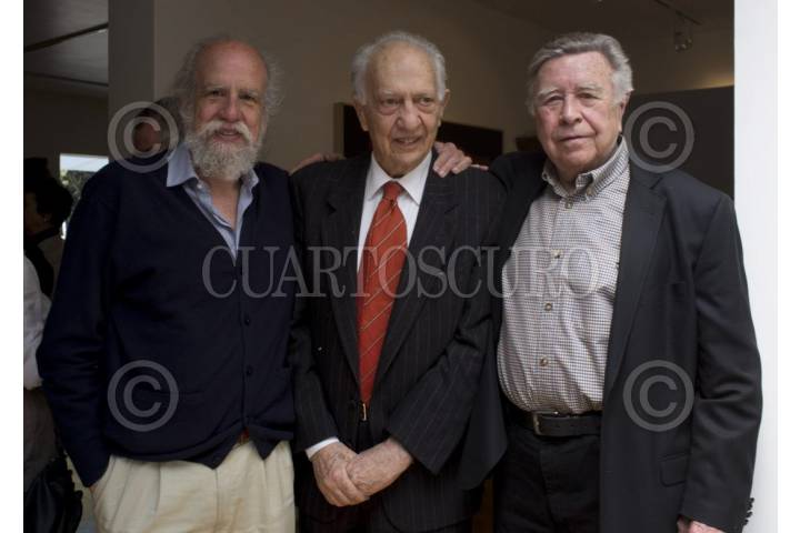 MEXICO, D.F., 04FEBRERO2012.- Fernando González Gortázar, Sergio Pitol con Manuel Felguerez, pintor nacido en Valparaiso Zacatecas, hoy durante la exposición en la galeria López Quiroga, en Polanco. FOTO: PEDRO VALTIERRA/CUARTOSCURO.COM