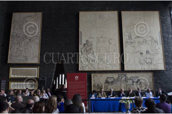 MÉXICO, D.F., 20SEPTIEMBRE2014.- Carlos Philips Olmedo, Carkos García Ponce, Allen Blevins y Federico Reyes Heroles, durante la presentación de la exposición “El hombre en la encrucijada. El mural de Diego Rivera en el Centro Rockefeller”, exposición que narra con ayuda de fotografías, la mayoría de autoría anónima, la historia del mural que Diego Rivera realizo para el Centro Rockefeller en Nueva York, mismo que fue removido por haber sido relacionado con una ideología socialista. El Museo fue diseñado por el pintor y muralista Diego Rivera en 1964, con asesoría técnica del arquitecto Juan O’Gorman. FOTO: MARÍA JOSÉ MARTÍNEZ /CUARTOSCURO.COM