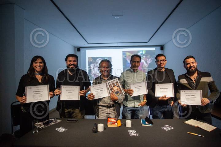CIUDAD DE MÉXICO, 27AGOSTO2025.- La jurado Elena Vega; el fotoperiodista Pedro Valtierra, director de la agencia Cuartoscuro; Cindy Dahena Pérez, ganadora del primer lugar; la fotógrafa Sandra Hordoñez y y el fotoperiodista y jurado, Mario Jasso se fotografían con la foto premiada en primer lugar durante l inauguración de la exposición del concurso nacional de fotografía ¿Cómo Miramos los Jóvenes? Organizado por la agencia y revista Cuartoscuro en el Museo Archivo de la Fotografía (MAF). FOTO: GALO CAÑAS/CUARTOSCURO.COM