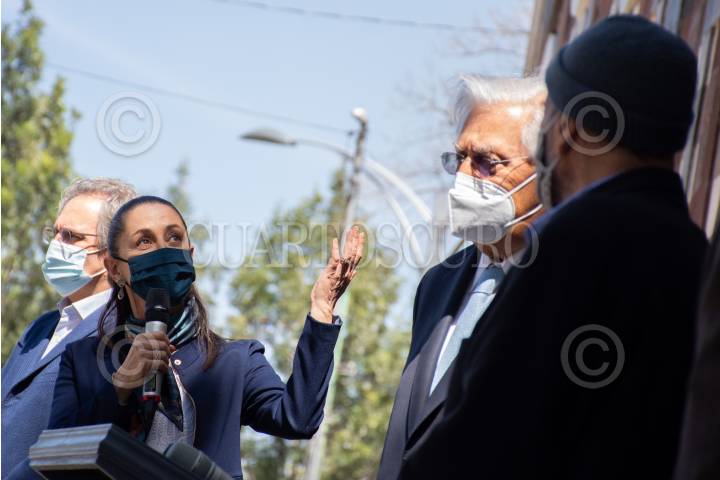Claudia Sheinbaum señala el mural del maestro Vicente Rojo.