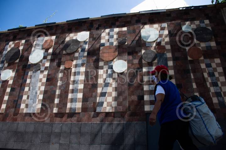Una mujer pasa frente al mural del maestro Vicente Rojo.