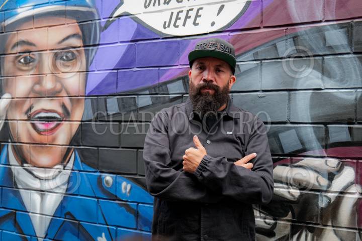 CIUDAD DE MÉXICO, 12AGOSTO2024.- Yuka, artista plástico, posó frente a su mural realizado para la inauguración del museo Mario Moreno Cantinflas ubicado en la colonia Guerrero. Este mural, hecho con técnica de aerosol, presenta a Cantinflas en sus películas más icónicas. FOTO: ALICE MORITZ /CUARTOSCURO.COM