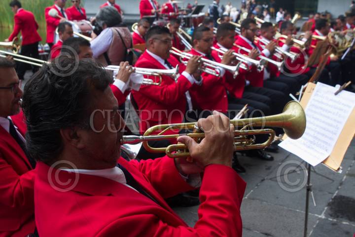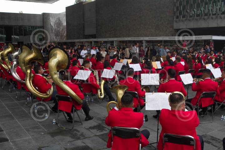 CIUDAD DE MÉXICO, 27SEPTIEMBRE2018.- La Banda Sinfónica Zacatecas participó en la inauguración de la Feria Internacional del Libro de Antropología e Historia, misma que concluirá el 7 de octubre, y en su edición 29 cuenta con Bolivia y Zacatecas como país y estado invitados. El programa incluye unas 300 actividades entre presentaciones de obras, coloquios, charlas, talleres infantiles, exposiciones, proyección de documentales y actos culturales y se espera que unas cien mil personas acudan al encuentro, que esta albergada en la explanada del Museo Nacional de Antropología. FOTO: MOISÉS PABLO /CUARTOSCURO.COM