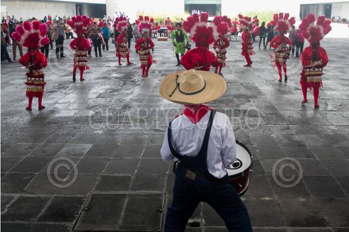 CIUDAD DE MÉXICO, 27SEPTIEMBRE2018.- La danza de Matlachines de Ojocaliente se hizó presente en la inauguración de la Feria Internacional del Libro de Antropología e Historia, misma que concluirá el 7 de octubre, y en su edición 29 cuenta con Bolivia y Zacatecas como país y estado invitados. El programa incluye unas 300 actividades entre presentaciones de obras, coloquios, charlas, talleres infantiles, exposiciones, proyección de documentales y actos culturales y se espera que unas cien mil personas acudan al encuentro, que esta albergada en la explanada del Museo Nacional de Antropología. FOTO: MOISÉS PABLO /CUARTOSCURO.COM