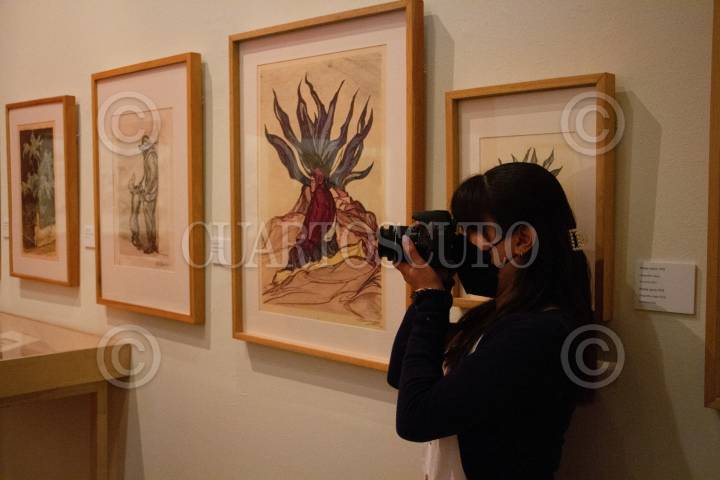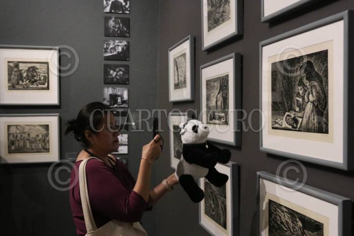 CIUDAD DE MÉXICO, 14AGOSTO2025.- Una joven toma fotografías durante el recorrido a medios de comunicación de la exposición "Leopoldo Méndez. De la estampa al mural en movimiento" en el Museo Nacional de la Estampa, la cual estará abierta al público a partir del 16 de agosto. FOTO: GRACIELA LÓPEZ/CUARTOSCURO.COM