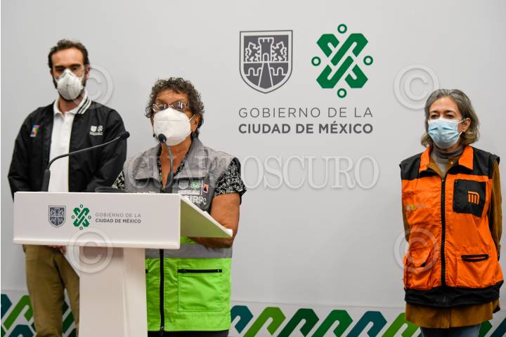 Andrés Lajous, Myriam Urzúa Venegas, y Florencia Serranía Soto, Florencia Serranía Soto, durante la conferencia de prensa para hablar del colapso que sufrió la vía elevada de la Línea, que se registró en la estación Oliva, el día de ayer.