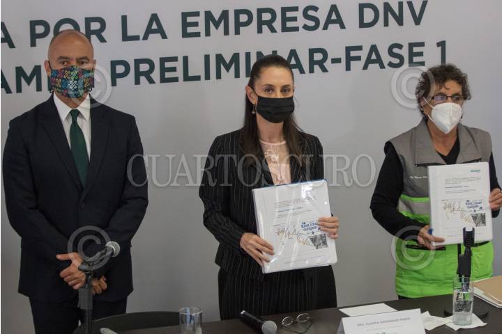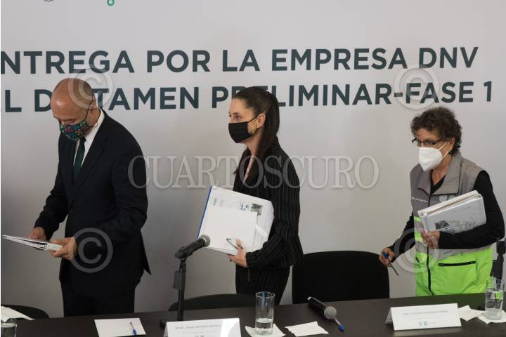 Jesús Esteva, secretario de Obras; Claudia Sheinbaum, Jefa de Gobierno, y Myriam Urzúa Venegas, secretari de Gestión Integral de Riesgos y Protección Civil de la Ciudad de México, muestra el informe sobre los peritajes del accidente de la Línea 12, realizado por la empresa DNV.